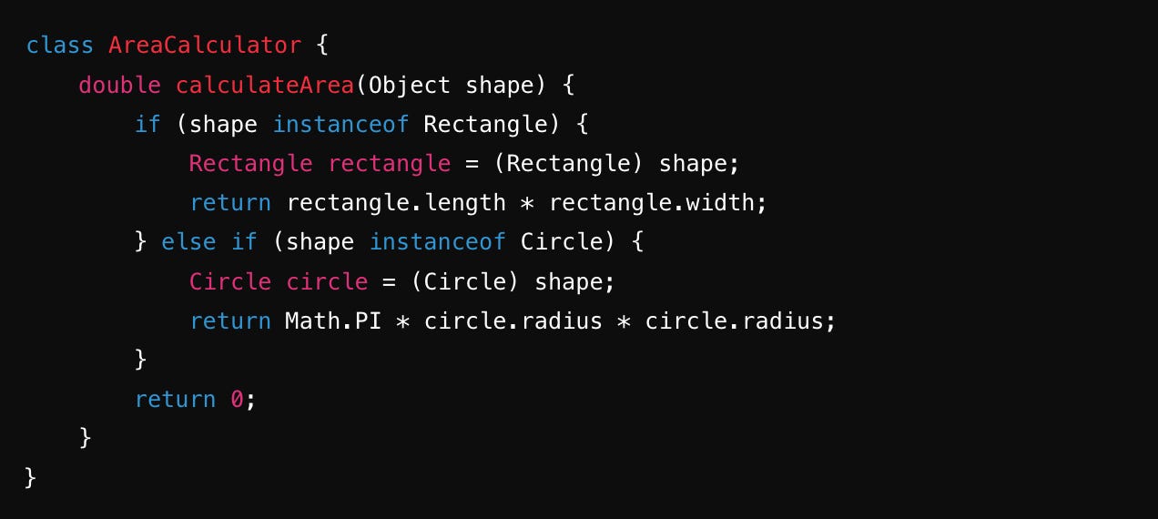 This approach violates the OCP because every time a new shape is added, you need to modify the AreaCalculator class, increasing the risk of errors.