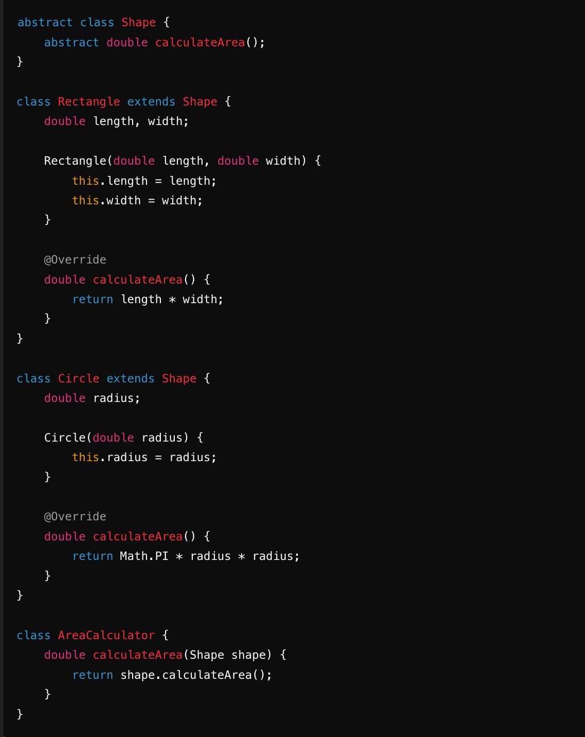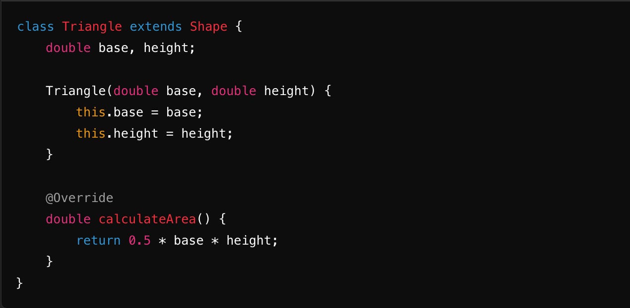 Now, if you want to add a new shape, such as a Triangle, you simply create a new class extending Shape: