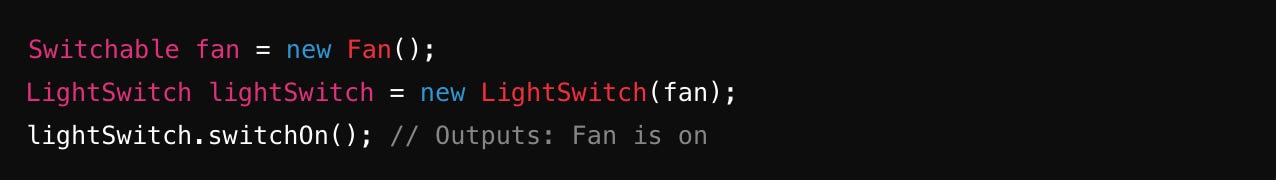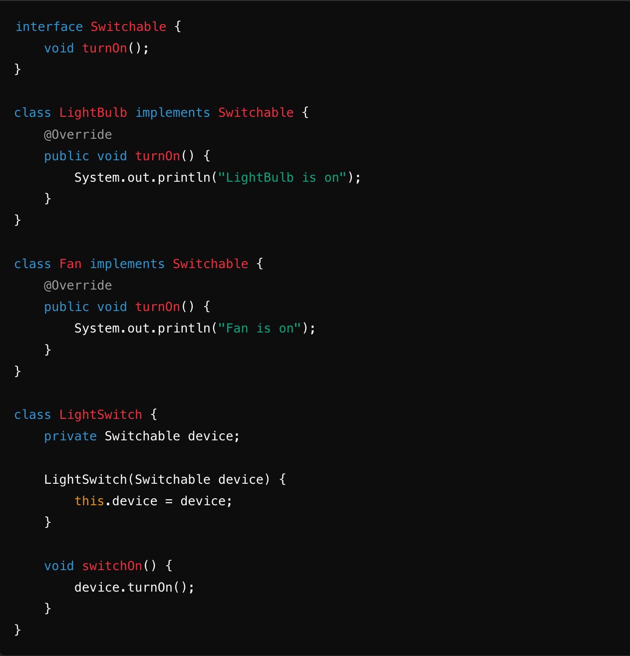 Now, the LightSwitch class depends on the Switchable interface, not a specific implementation like LightBulb. This makes it easy to change or extend functionality without modifying the LightSwitch class.