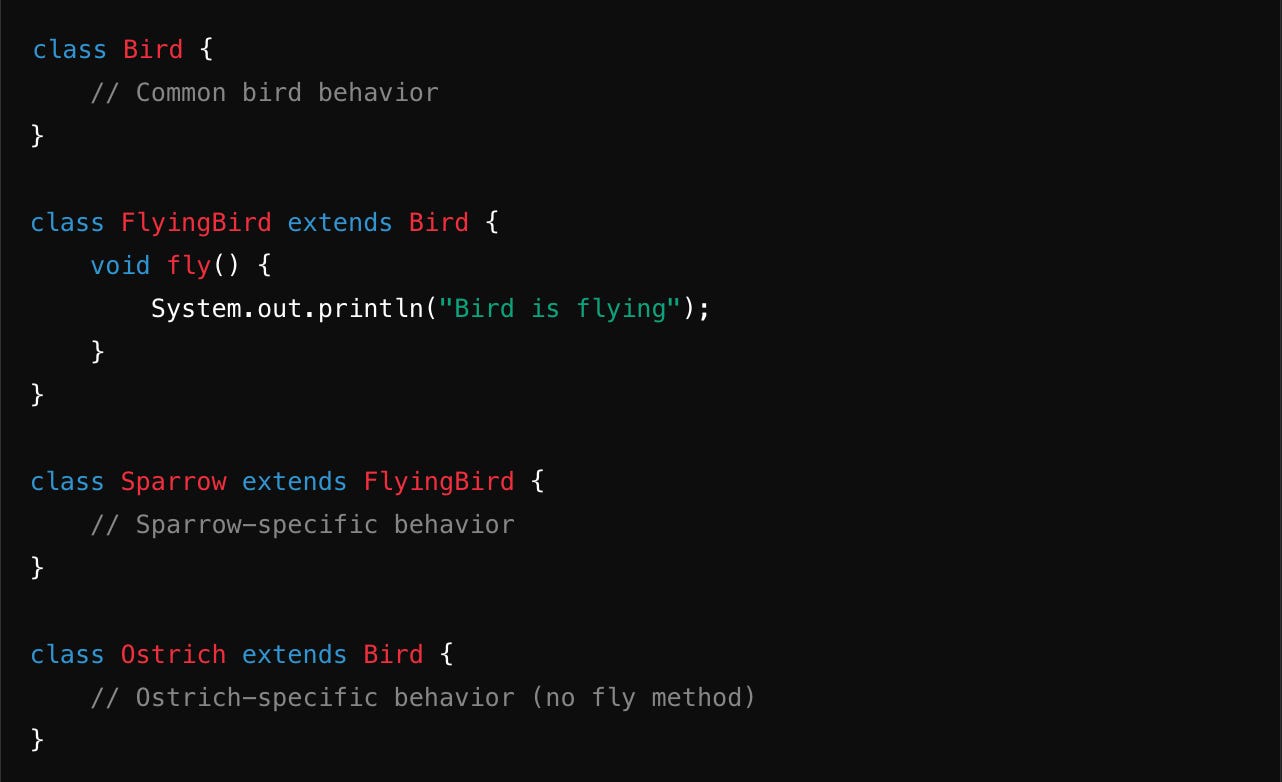 Consider the example of birds. If you have a base class Bird with a fly method, you might assume that all birds can fly. However, not all birds can fly, so this assumption is flawed: