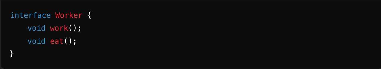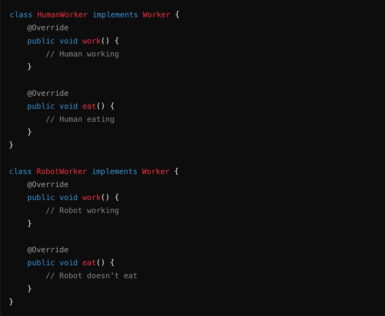 Now, suppose you have a HumanWorker and a RobotWorker. The RobotWorker doesn’t need to implement the eat method, but it’s forced to do so: