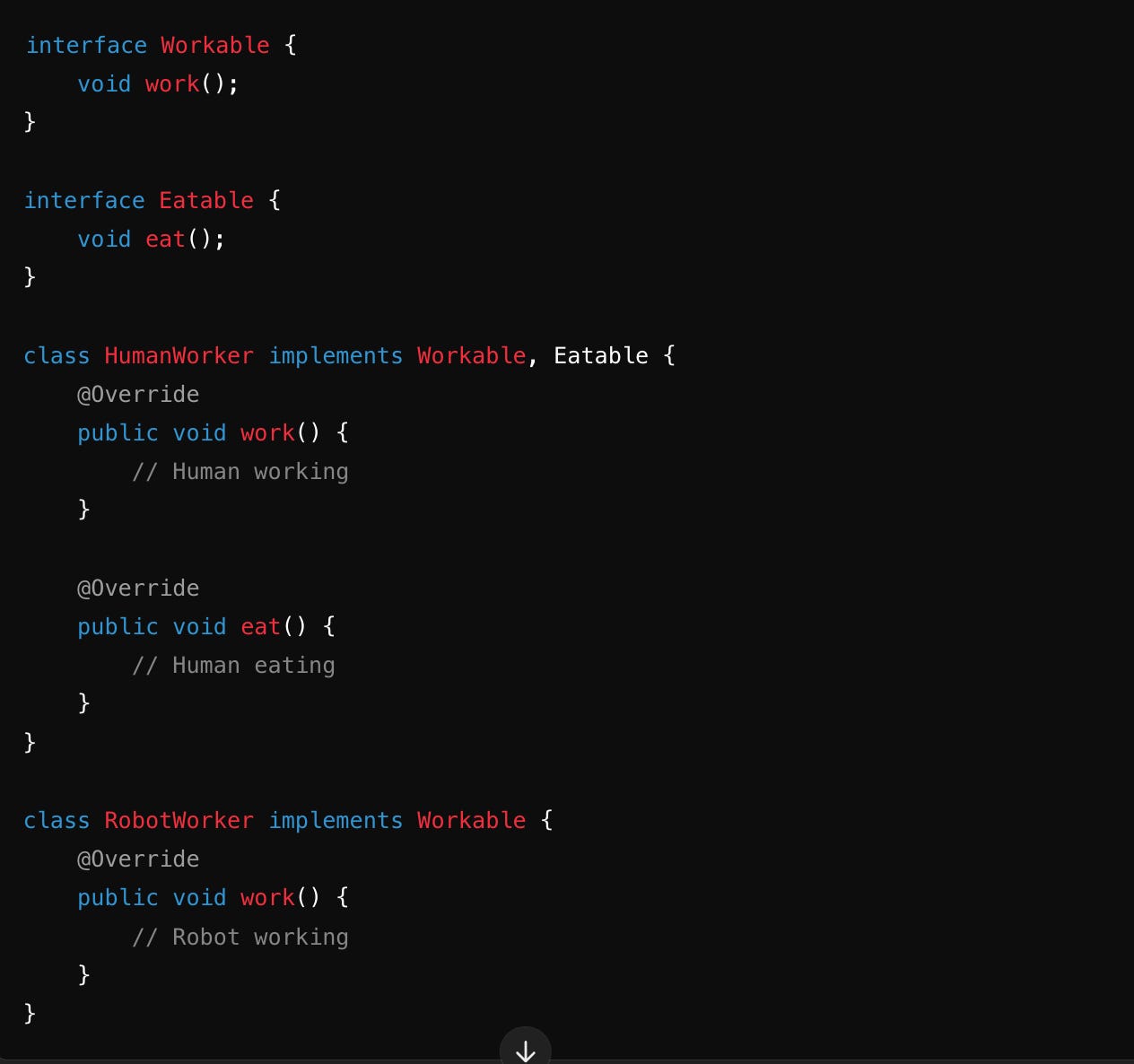 Now, RobotWorker only implements what it needs (Workable), making the code cleaner and more flexible.