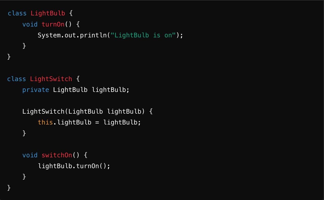 In this case, the LightSwitch class is tightly coupled to the LightBulb implementation. If you want to switch to a different type of light, you’d have to modify the LightSwitch class.