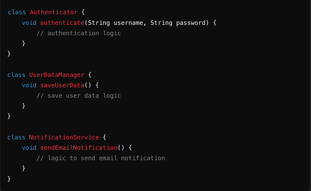 Authenticatorhandles authentication.UserDataManagerhandles user data.NotificationServicehandles notifications.