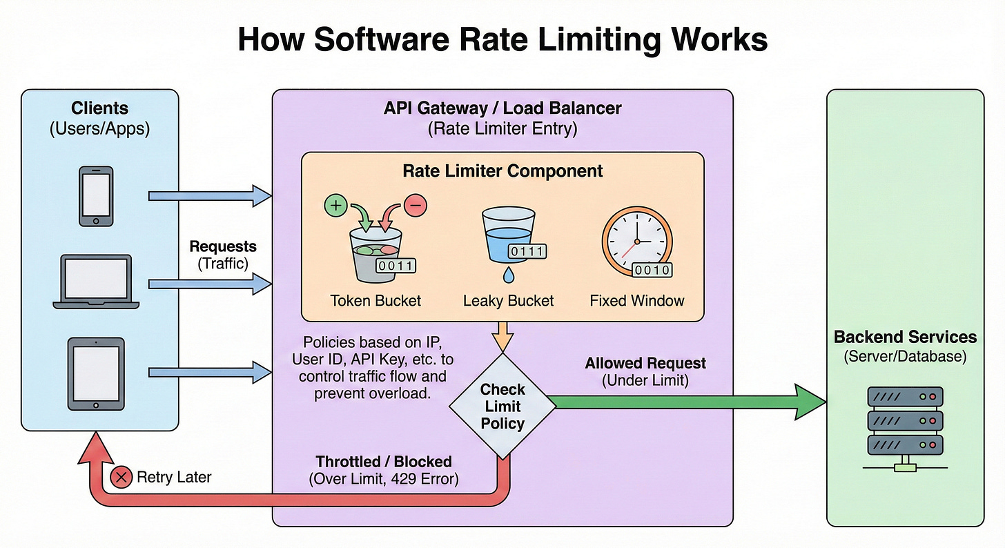 Rate limiting restricts how many requests a user or system can send in a given time. It protects servers from overload or abuse.