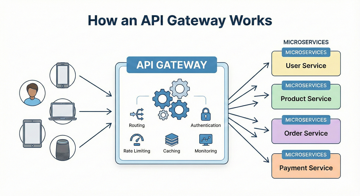 The gateway forwards each request to the correct service and handles authentication, rate limits, and logging.