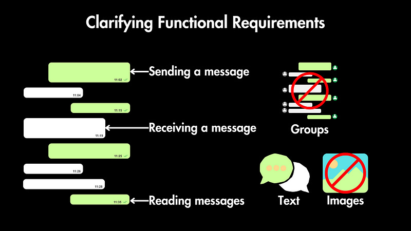 Let’s narrow down the scope with some questions to the interviewer, as designing the entire WhatsApp platform in an hour is unrealistic: