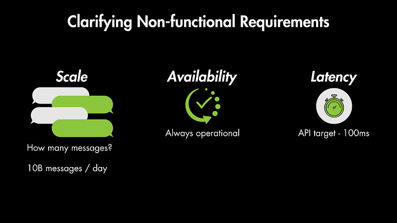 Scale: First, let’s talk about the scale, which is how large the system will be and how many messages it will handle. Let’s assume that 10 billion messages are sent daily, and we aim to double that within a year.