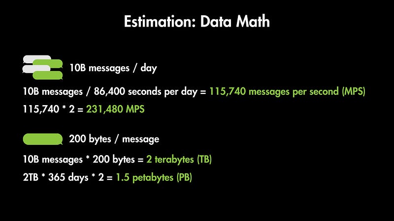 With 10 billion daily messages, we have roughly 10B messages / 86,400 seconds per day = 115,740 messages per second (MPS). Doubling within a year means we should plan for 115,740 * 2 = 231,480 MPS.