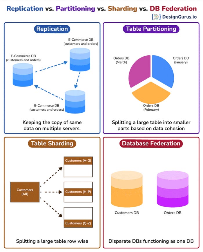 And here is a nice diagram from DesignGurus.io on how you can use these techniques to improve performance of your database: