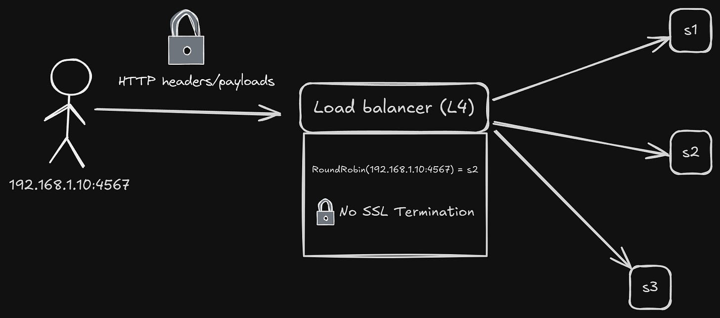 An L4 load balancer doesn’t look into the HTTP headers or payload. It just sees: