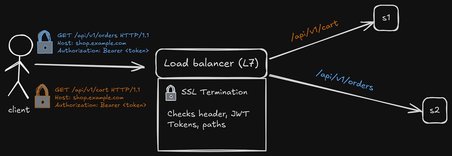 L7 load balancers operate at the application layer of the OSI model, which means they understand and manipulate the content of the actual HTTP (or gRPC, WebSocket, etc.) requests, not just IPs and ports like L4.